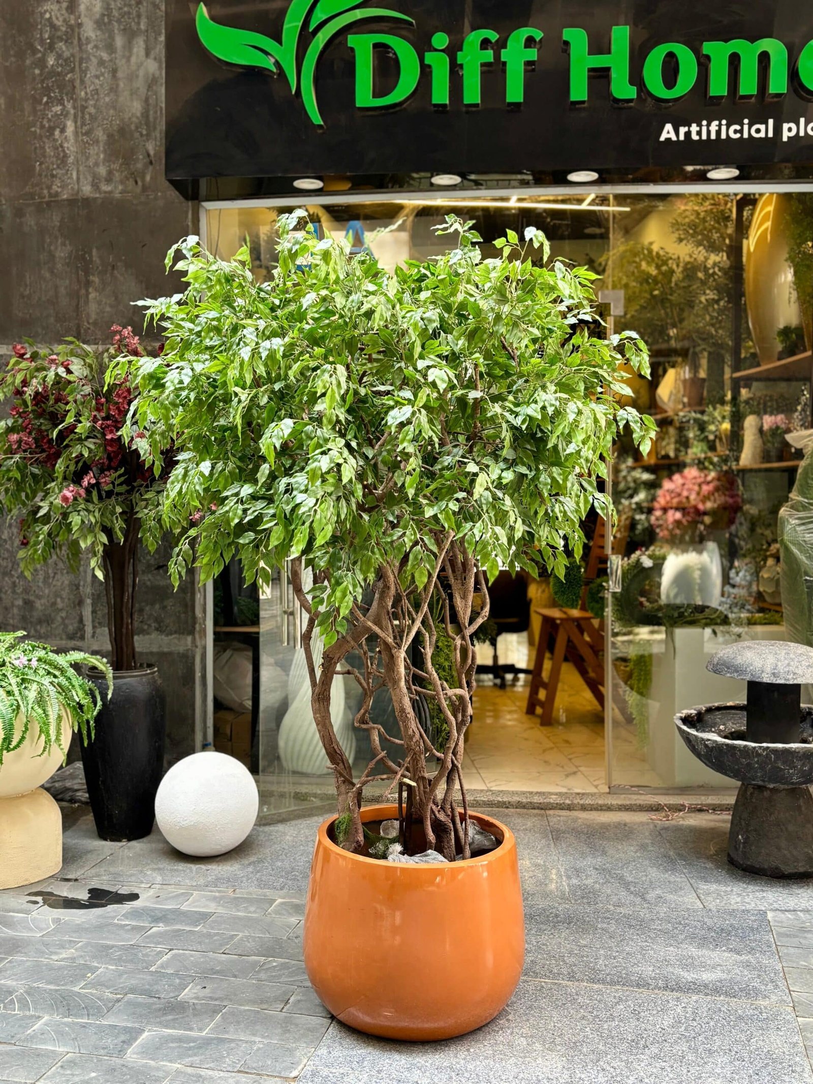 A beautiful natural Ficus Benjamina tree with a twisted trunk, creating a unique and artistic shape. The tree has a full, bushy crown of green variegated leaves, adding a refreshing and natural touch. It is placed in a glossy orange pot, making it stand out as an elegant decorative piece for both indoor and outdoor spaces.