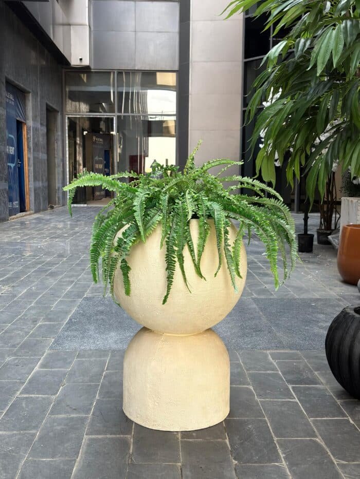 A stylish beige planter with a unique contemporary design, crafted in a rounded, sculptural shape that adds a touch of elegance to any space. The arrangement is completed with vibrant, lifelike artificial fern leaves cascading gracefully over the edges, creating a fresh and natural aesthetic without the need for maintenance. Perfect for entrances, lobbies, offices, or home interiors, this decorative piece combines modern artistry with greenery to enhance both indoor and outdoor settings.