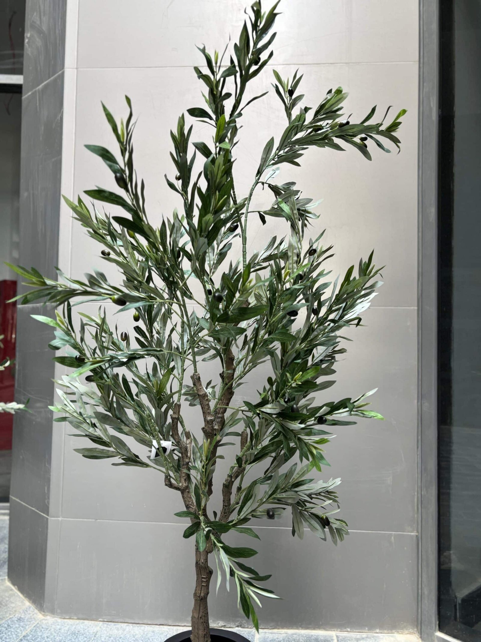 A stylish artificial olive tree designed to add a natural Mediterranean touch to any space. It features realistic green leaves, small olive fruits, and a textured trunk that gives it a lifelike appearance. Placed in a modern black pot with decorative stones, this tree is perfect for enhancing living rooms, offices, and entrances while staying fresh and beautiful all year with zero maintenance.
