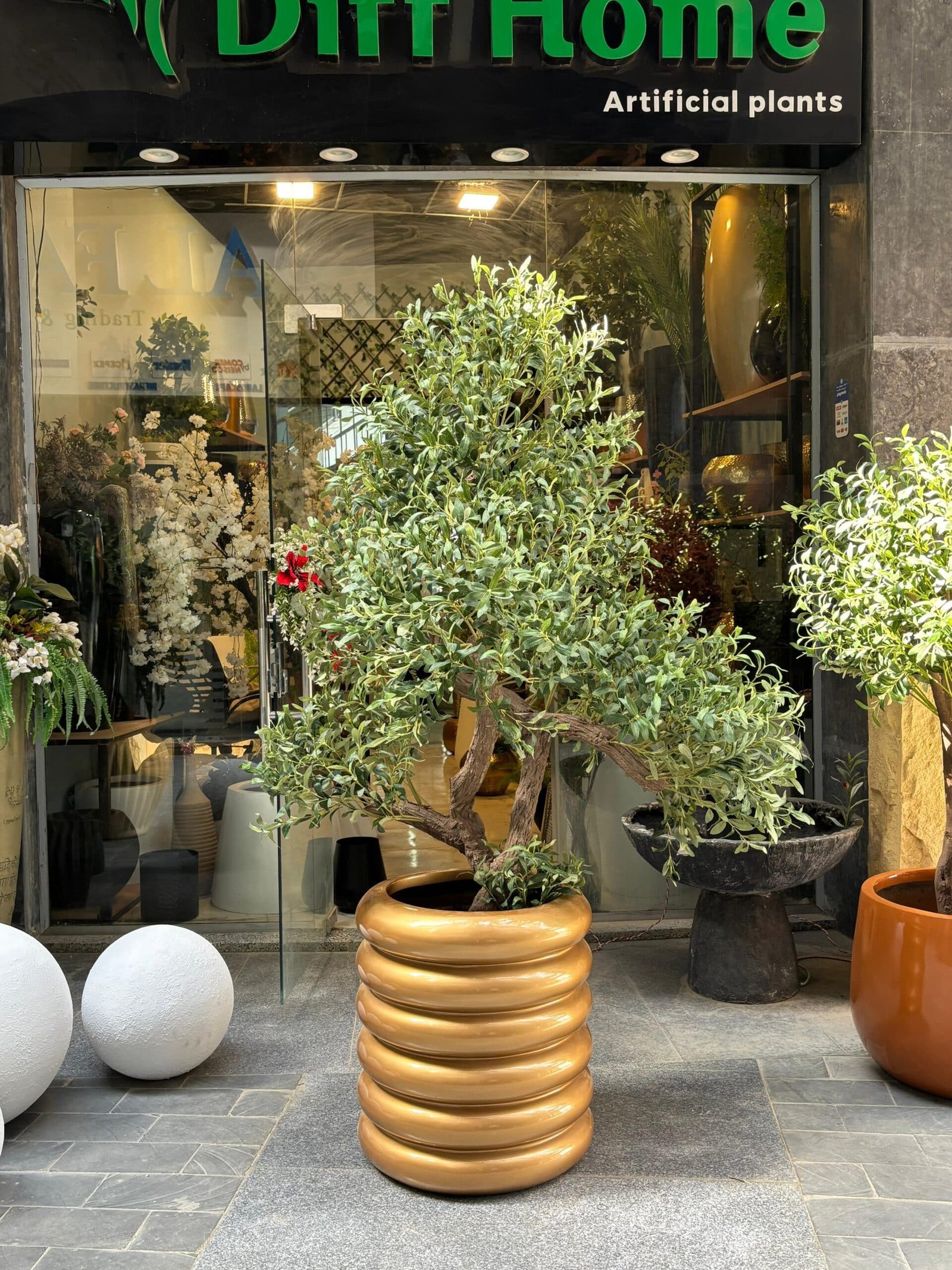 Standing at an impressive 2 meters, this olive tree features a natural, textured trunk and a high-volume crown filled with lush, lifelike foliage. Its realistic design captures the charm and elegance of a mature olive tree, making it a perfect statement piece for both indoor and outdoor spaces. With its grand height and vibrant greenery, it brings a sense of nature’s beauty into any setting—without the need for maintenance.”
