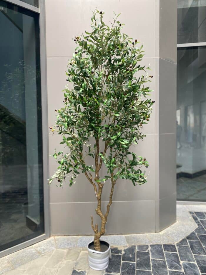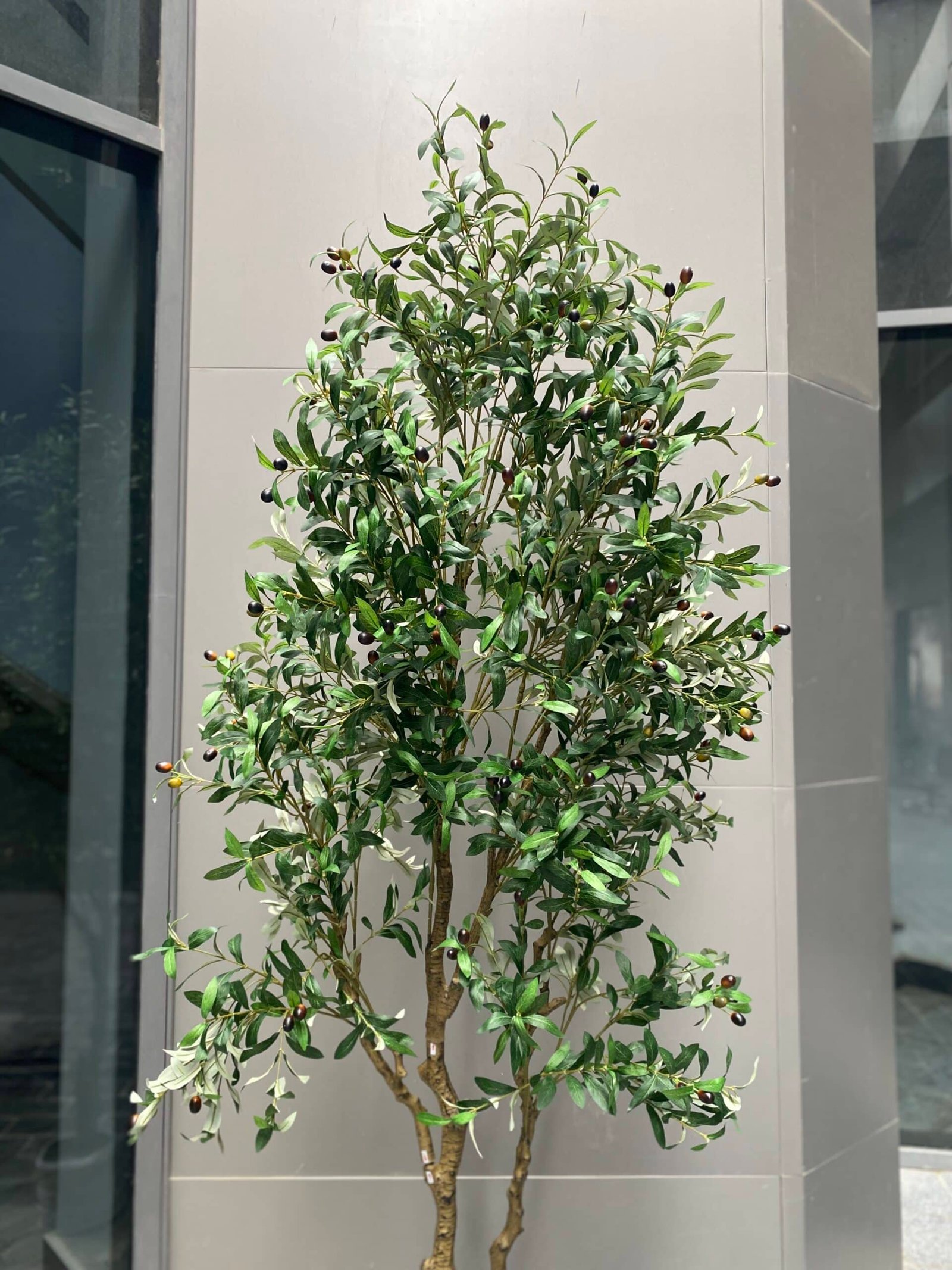 The olive tree is an ancient and sturdy tree with a twisted, thick trunk and sprawling branches. Its leaves are slender, silvery-green, and slightly shiny, creating a peaceful, enduring look. Often symbolizing wisdom and longevity, the olive tree has a natural, timeless beauty and a serene presence in any landscape.