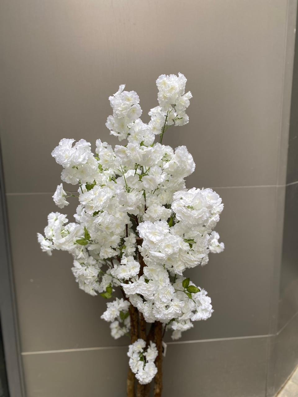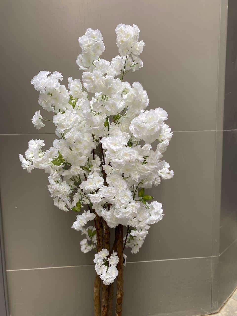 An elegant artificial white blossom tree featuring lush, full blooms and natural wooden trunks. Perfect for adding a touch of sophistication and freshness to any indoor space.