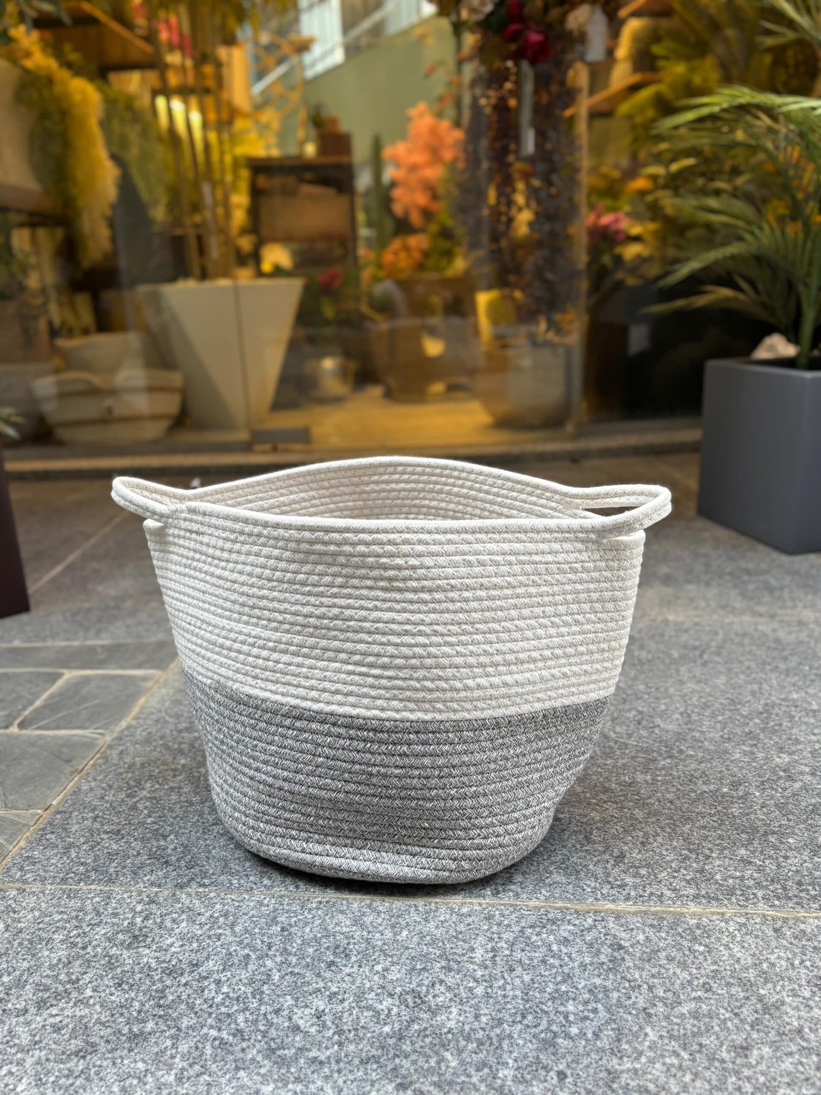A modern woven plant basket designed to display plants in a stylish and natural way. It features a beautiful two-tone design in beige and grey that blends easily with different interior styles. The durable rope material and sturdy structure make it perfect for holding indoor plants or artificial trees, while the side handles allow for easy placement and movement. A simple yet elegant piece that adds warmth and texture to any space. 🌿✨