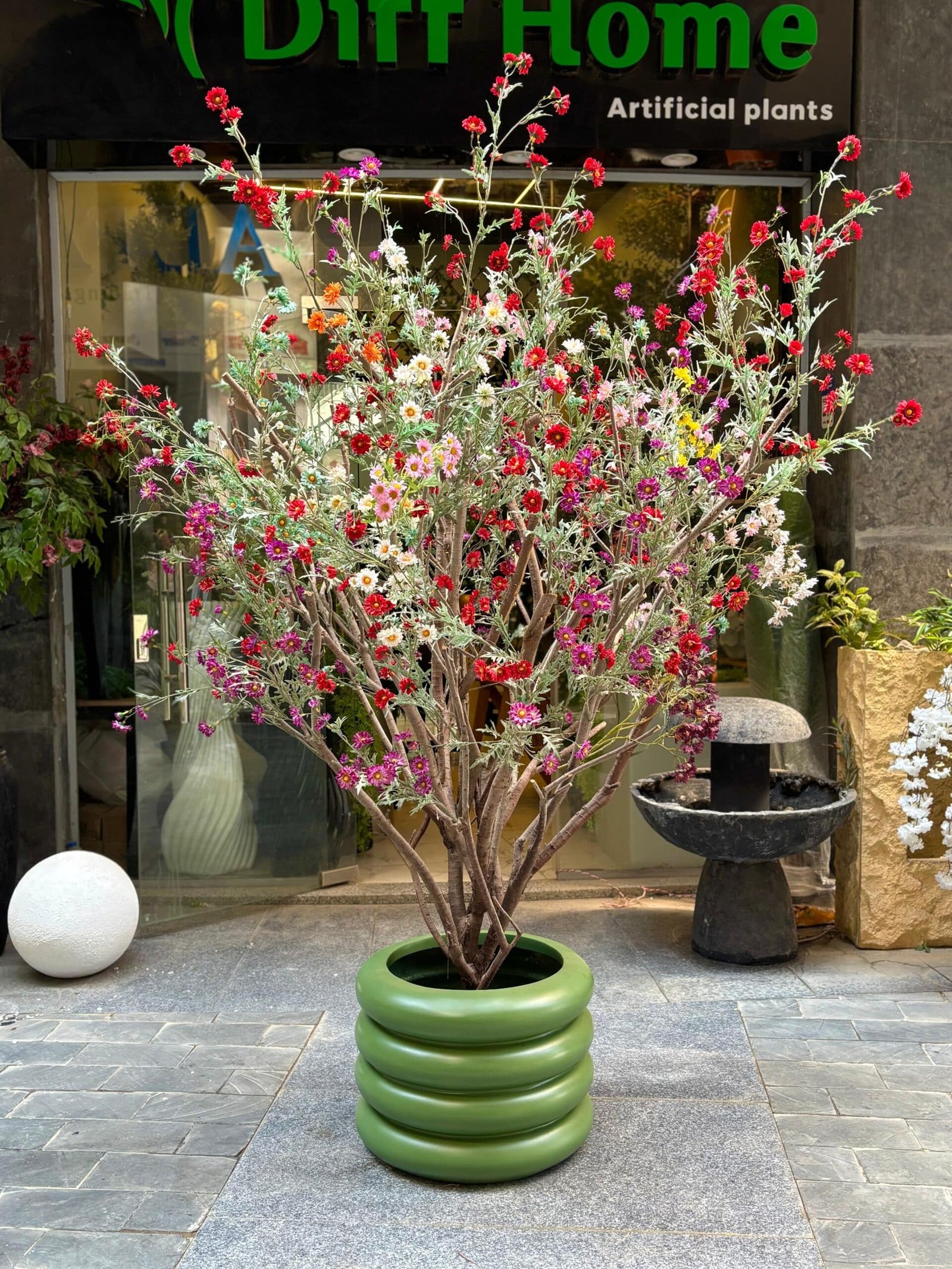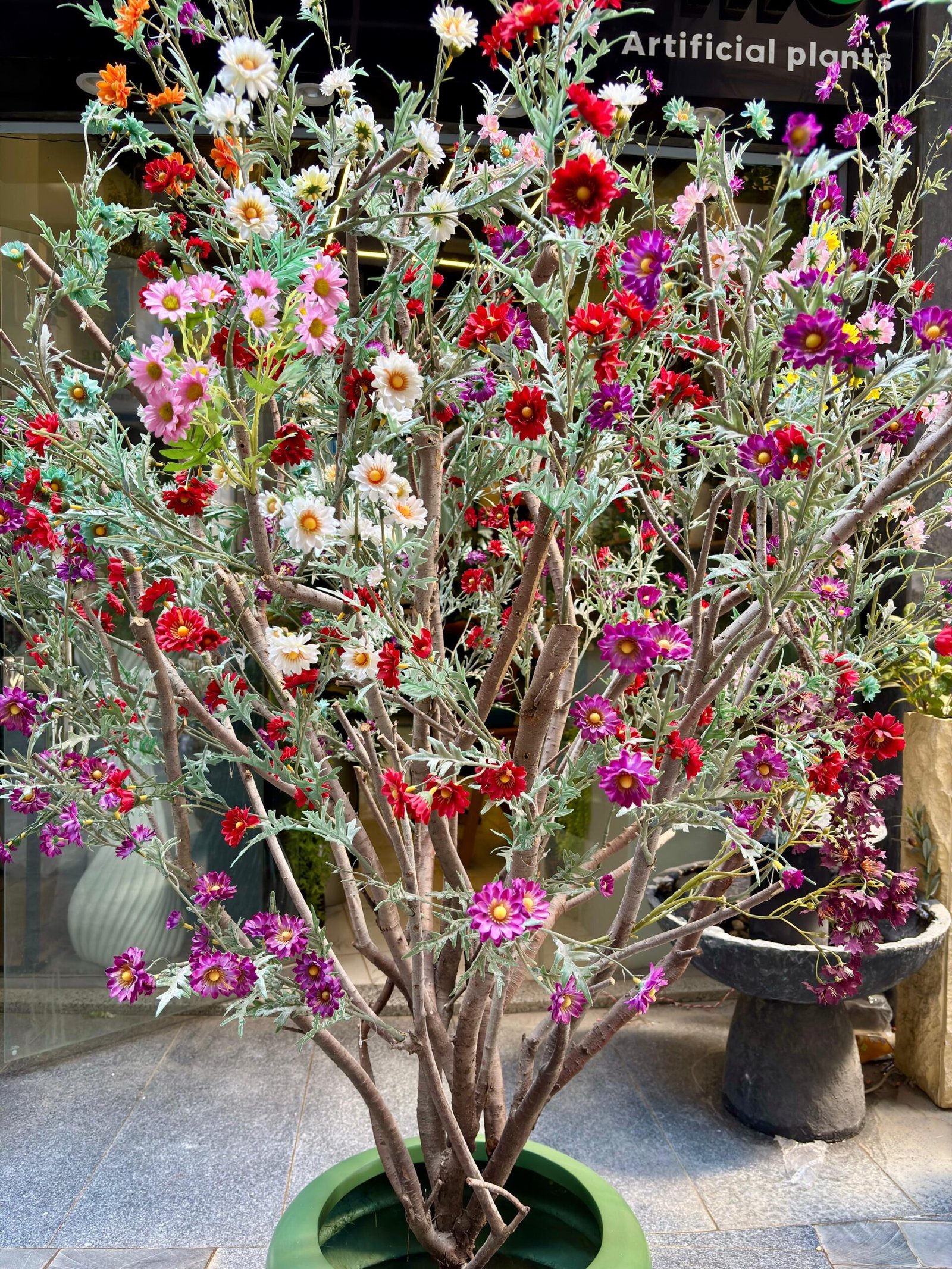 An artificial jasmine tree with colorful flowers and lush green leaves, supported by a natural trunk.